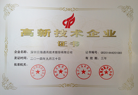 2012年3月25日,公司全資子公司深圳市海生機房技術有限公司被認定為“國家級高新技術企業”稱號。?